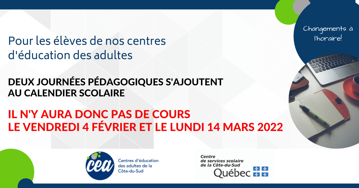 Changements au calendrier scolaireMessage important! Il n’y aura pas de cours le 4 février et le 14 mars.
